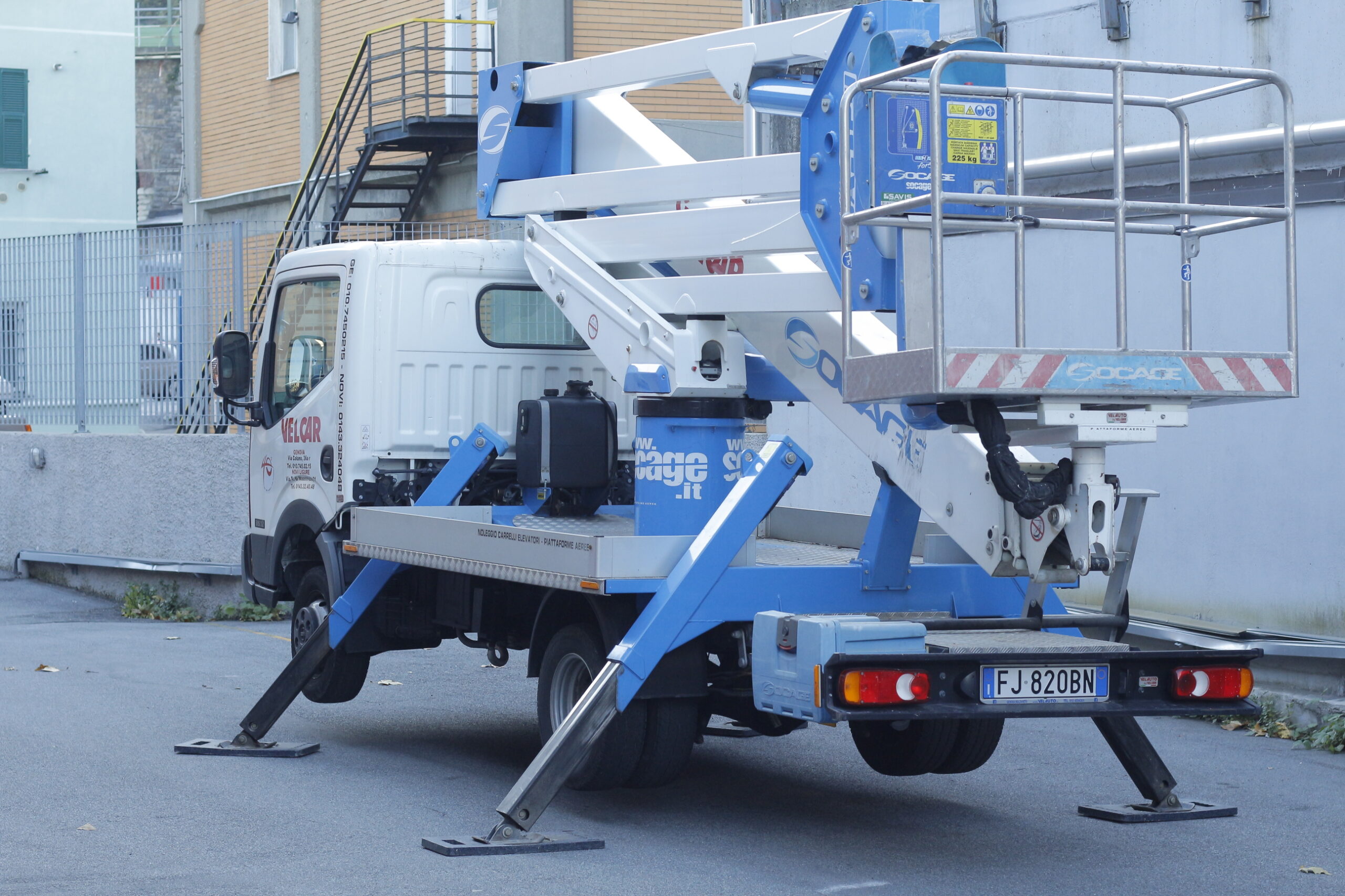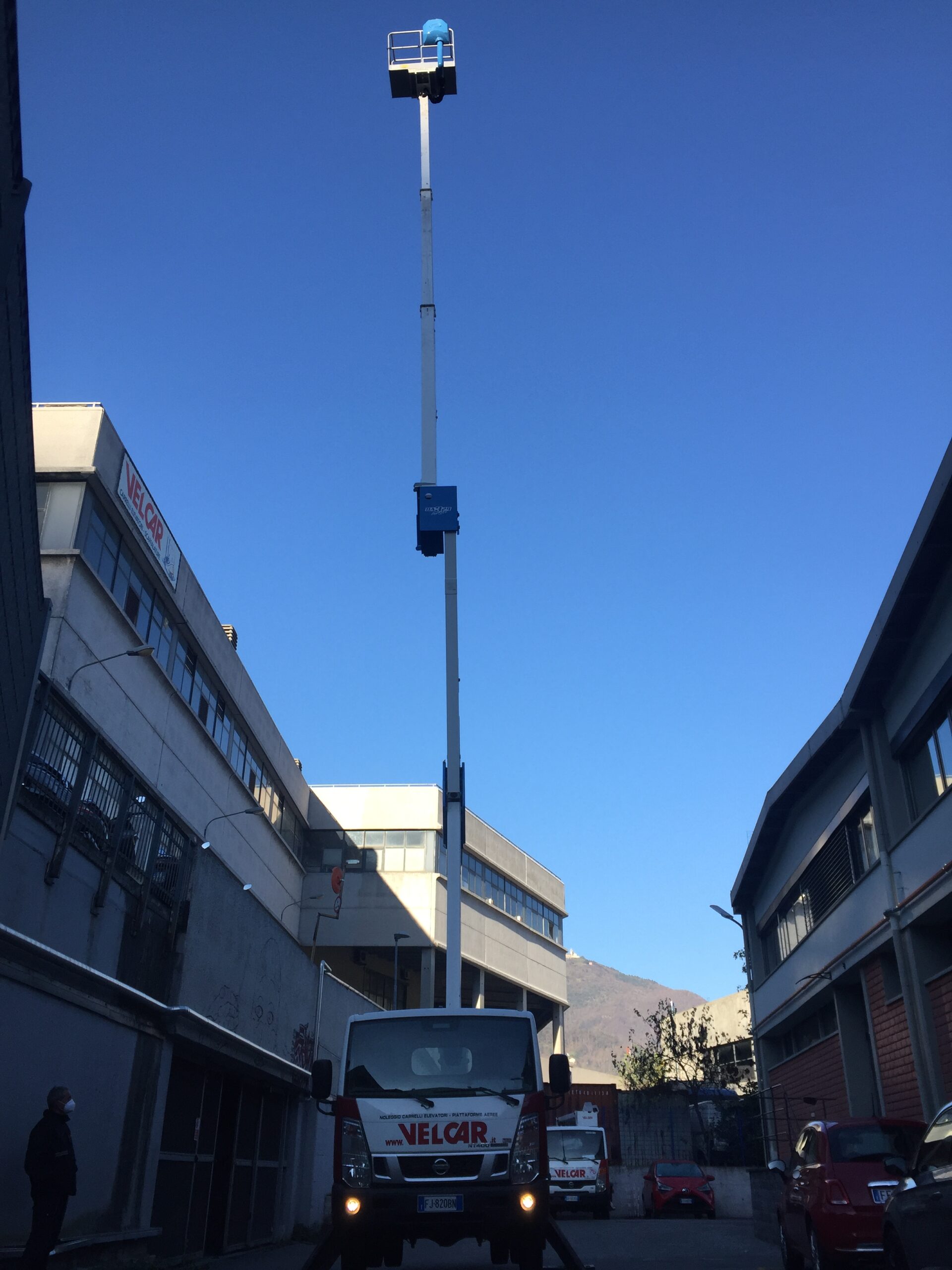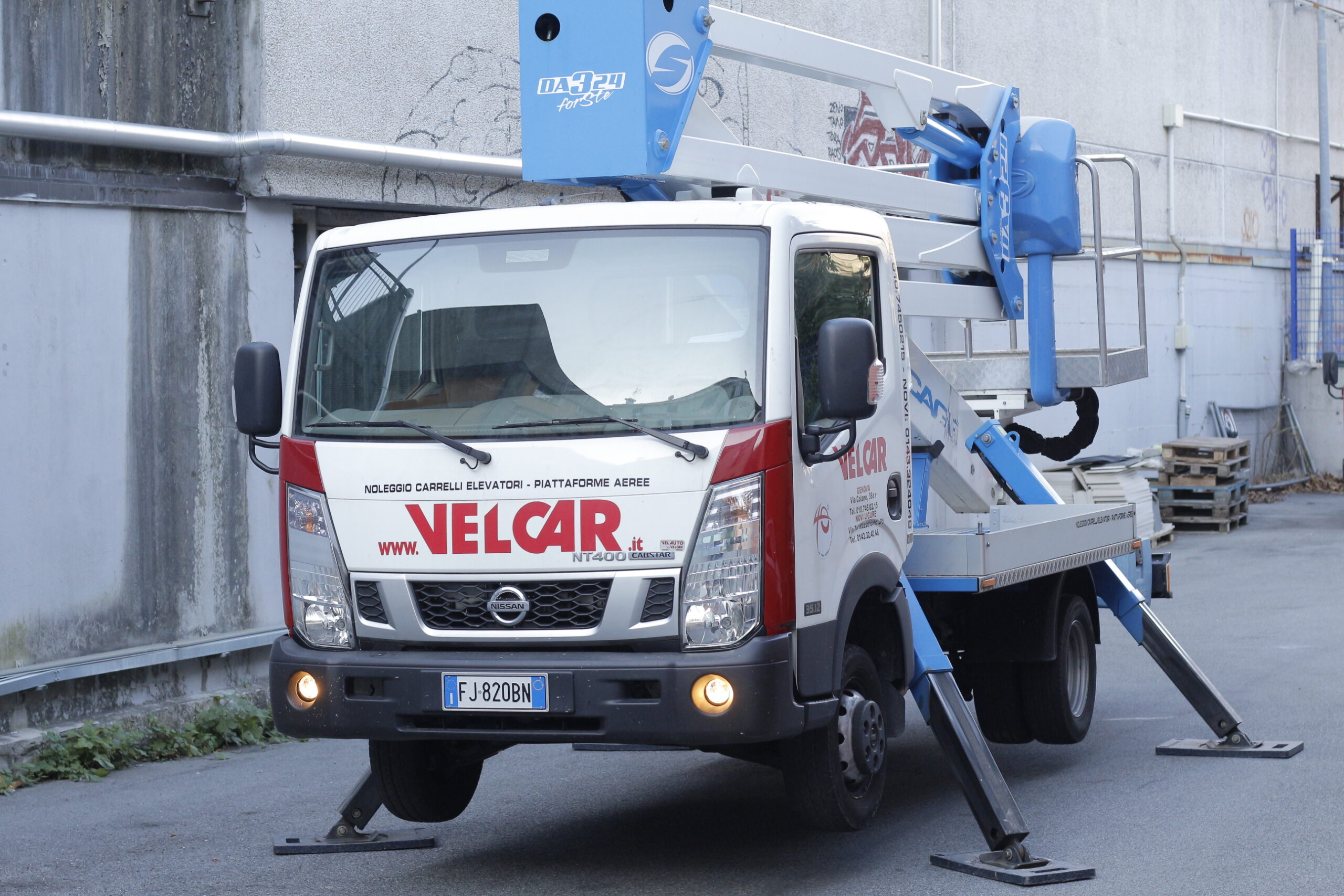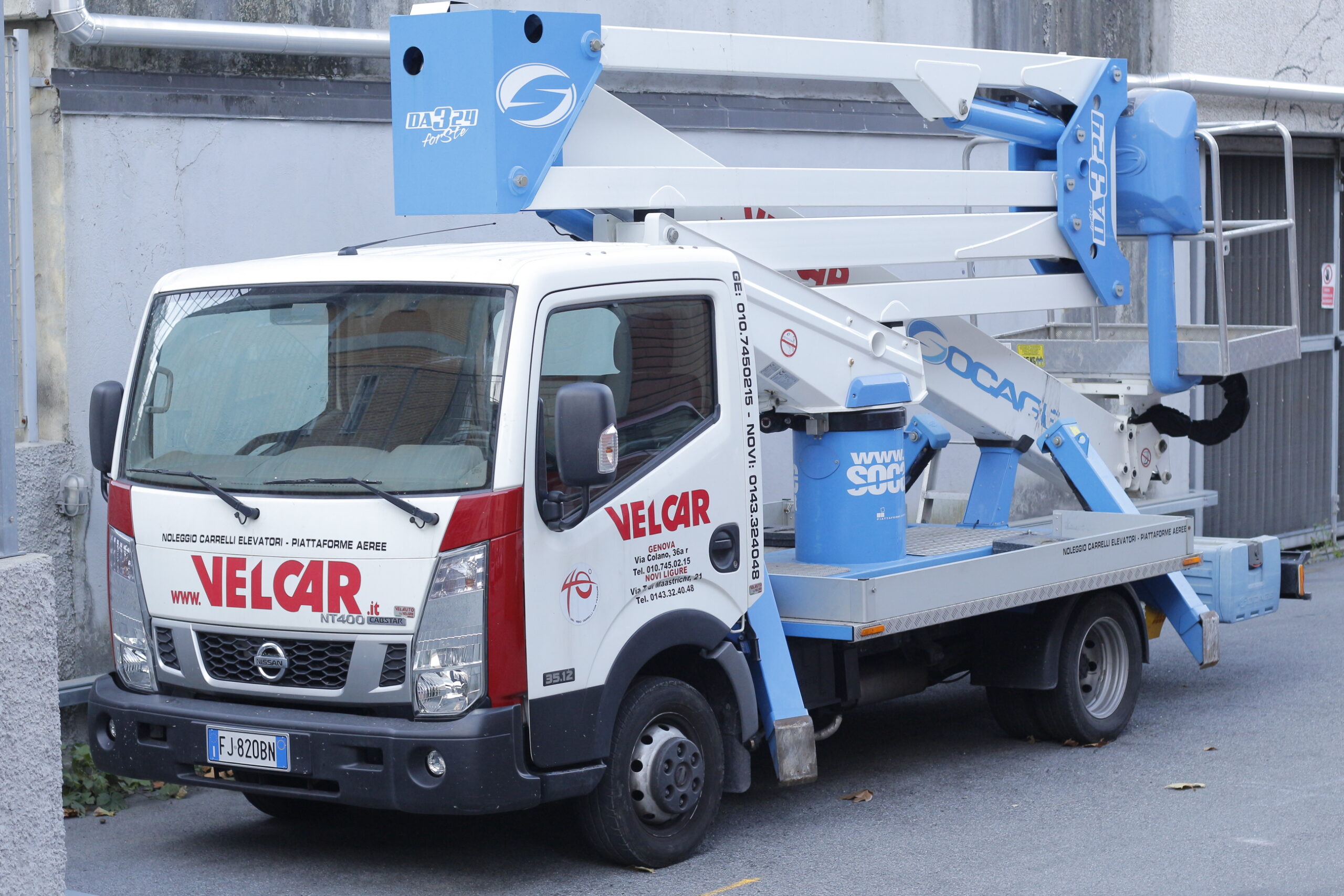 Macchina con ottime prestazioni per la particolare configurazione del sistema di stabilizzazione, per l’ampia dimensione del cestello porta persone e per gli optional previsti. Montata su veicolo Nissan Cabstar 35/3.